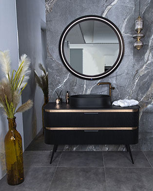 z kamienia i trzy pojemne szuflady z cichym domykiem łączą estetykę z wygodą codziennego użytkowania. Dobrze wygląda w łazienkach, w których liczy się wyrazisty,